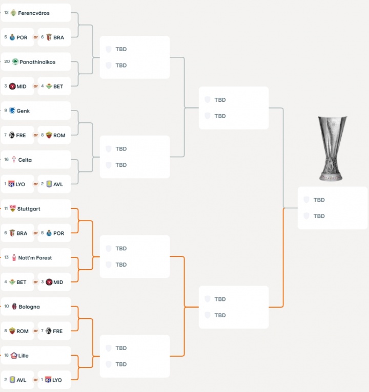 淘汰赛附加赛晋级8队(非种子队):亨克(比甲)、博洛尼亚(意甲)、斯图加特(德甲)、费伦茨瓦罗斯(匈甲)、诺丁汉森林(英超)、塞尔塔(西甲)、里尔(法甲)、帕纳辛纳科斯(希腊超)